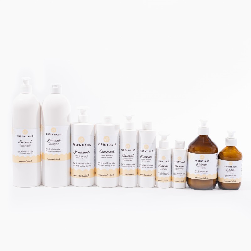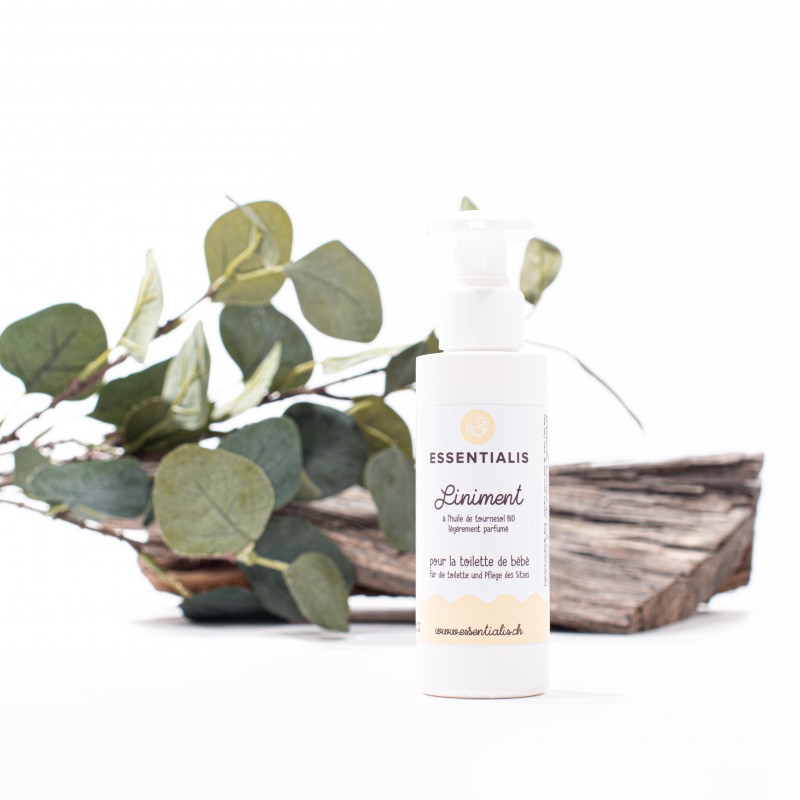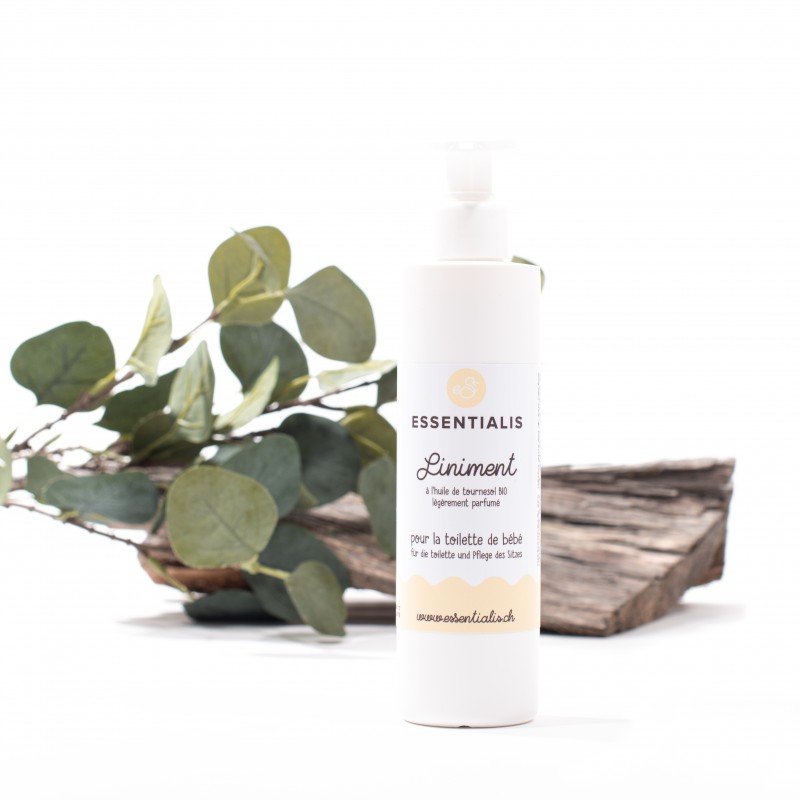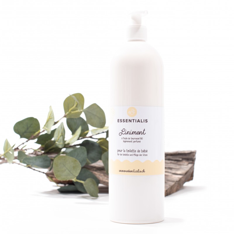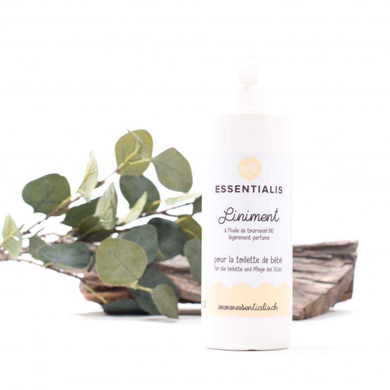 Le liniment Essentialis peut être utilisé comme nettoyant et ainsi remplacer les lingettes humides "cra-cra". Il suffit d'appliquer une petite quantité de liniment sur un tissu doux (coton jetable, coton lavable, lingette sèche, etc.), de le passer sur les fesses de bébé et de remettre une couche propre! Bébé est ainsi nettoyé et protégé jusqu'au prochain change. Sans rinçage, ni séchage.